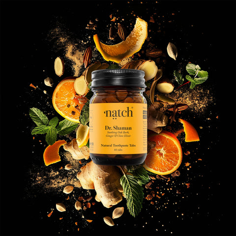 NatchUrtebaserte tannkremtabletter fra Natch med hydroksyapatitt, eikebark, nellik og ingefær – fluorfrie, veganske og plastfrie for sensitiv munn.