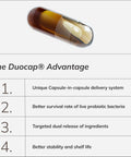 - Duocap®-teknologi, en kapsel-i-kapsel-løsning som beskytter sensitive ingredienser og sikrer målrettet frigjøring i tarmen