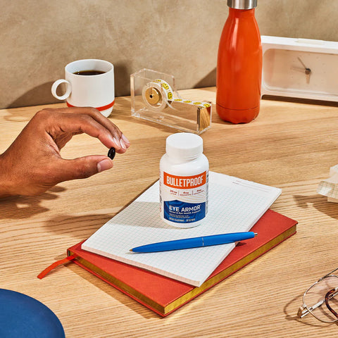 BulletproofStopp den negative effekten av blått lys med Eye Armour. Dette tilskuddet er laget med naturlige karotenoider og antioksidanter for å beskytte mot belastningen på øynene skapt av den digitale hverdagen vi lever i.